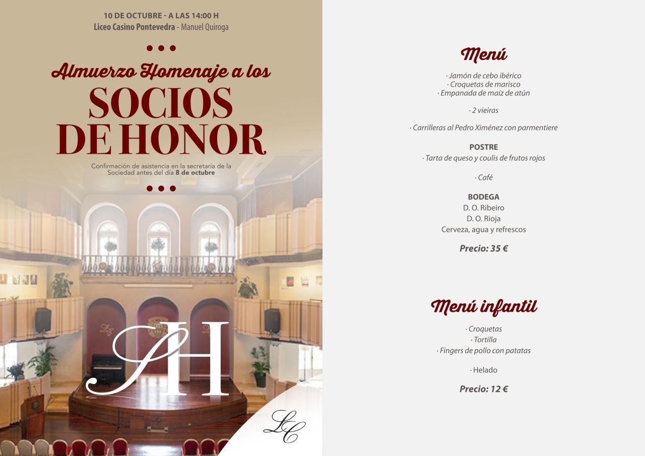 Para celebrar este feliz acontecimiento los socios de honor están invitados junto con un acompañante. Al acto también podrán asistir cuantos socios y socias, familiares y amigos retiren la oportuna tarjeta en la Secretaría de la Sociedad antes del día 8 de octubre, previo pago del número de cubiertos que solicite cada socio o socia. Precio menú adultos: 35 €. Precio menú infantil: 12 €.