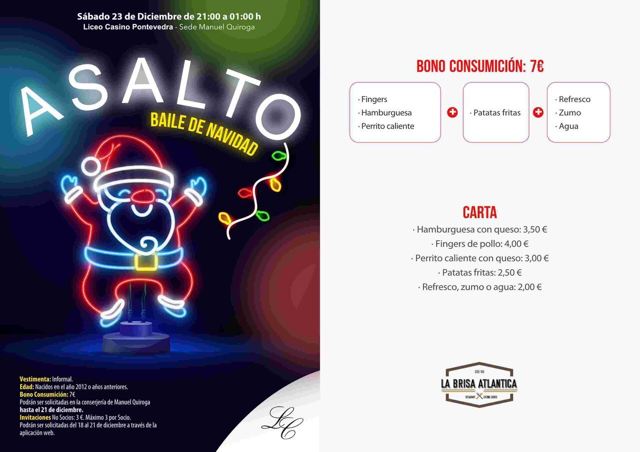 El sábado 23 de diciembre celebramos el Asalto Baile de Navidad para aquellos socios nacidos en el año 2012 o anteriores, en de 21,00 a 01,00 h.