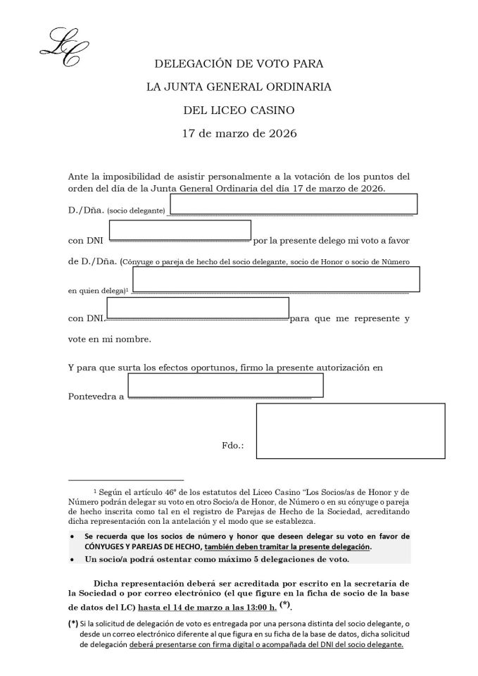 • Los socios de Honor y de Número que deleguen su voto en cónyuge o pareja de hecho deben tramitar igualmente la delegación.