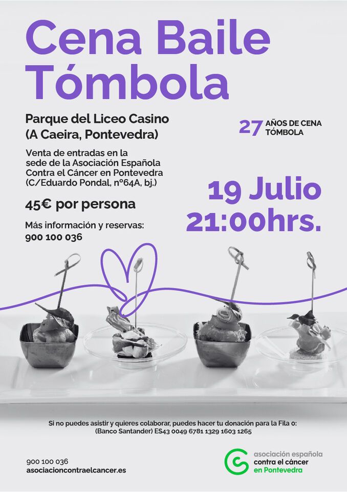 El viernes, día 19 de julio alas 21,00 horas, se celebrará en el Parque de A Caeira, la Cena -Baile con Tómbola a beneficio de la AECC. La finalidad de este evento es la de ayudar a subvencionar los distintos programas y servicios con los que cuenta actualmente la asociación: atención social, ayudas económicas a enfermos, atención psicológica, atención a enfermos en fase terminal, investigación...