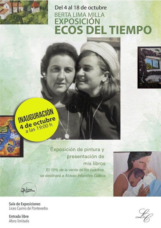El Liceo Casino de Pontevedra acoge la exposición "Ecos del Tiempo" de la artista Berta Lima, el próximo sábado 4 de octubre, a las 19:00 horas. La exposición es una propuesta cultural que combina pintura y literatura en un emotivo recorrido por la memoria y las emociones.