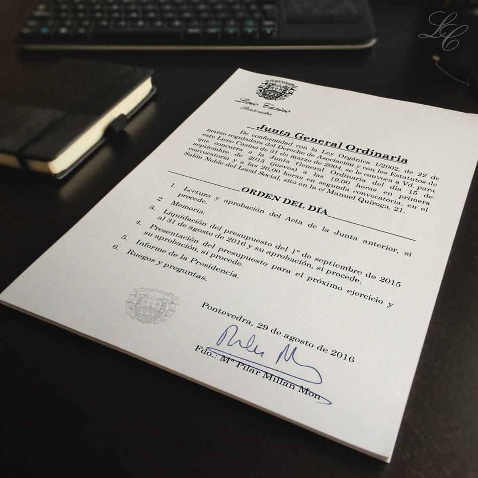 De conformidad con la Ley Orgánica 1/2002, de 22 de marzo, reguladora del Derecho de Asociación y con los Estatutos de este Liceo Casino de 31 de marzo de 2004, se convoca a todos los Socios de Honor y de Número a que concurran a la Junta General Ordinaria del día 15 de septiembre de 2016 (jueves) a las 19,00 horas en primera convocatoria y a las 20,00 horas en segunda convocatoria, en la Sala Méndez Nuñez del Local social, sito en la C/ Manuel Quiroga, 21.       ORDEN DEL DÍA