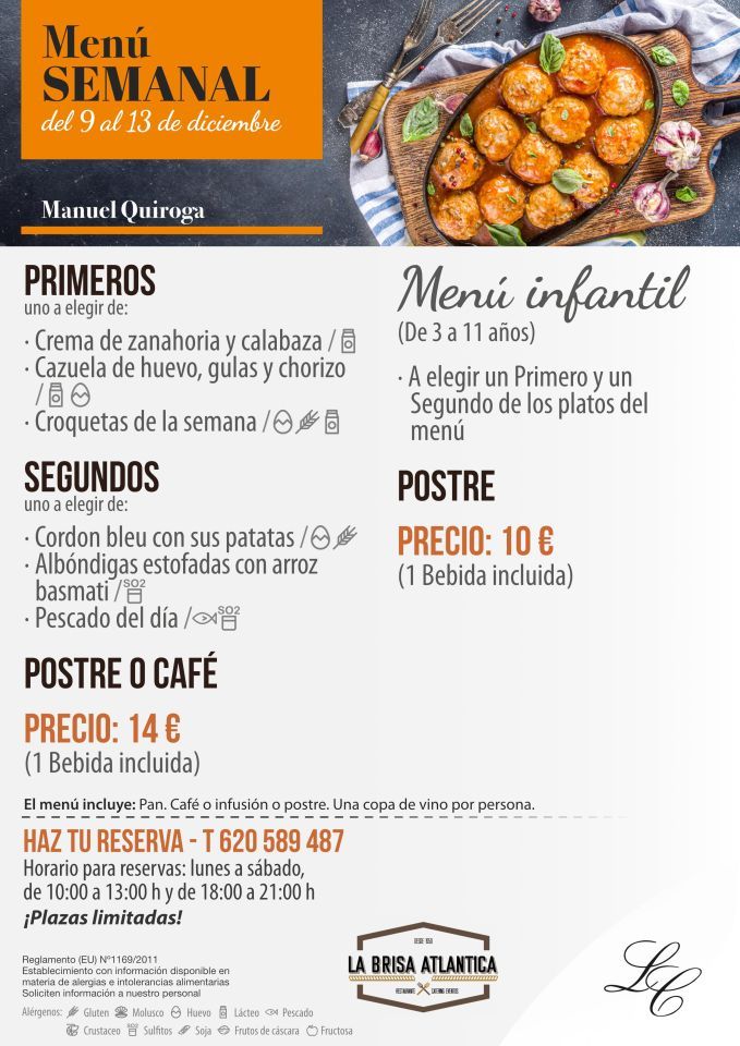 Menú semanal en Manuel Quiroga del 9 al 13 de diciembre