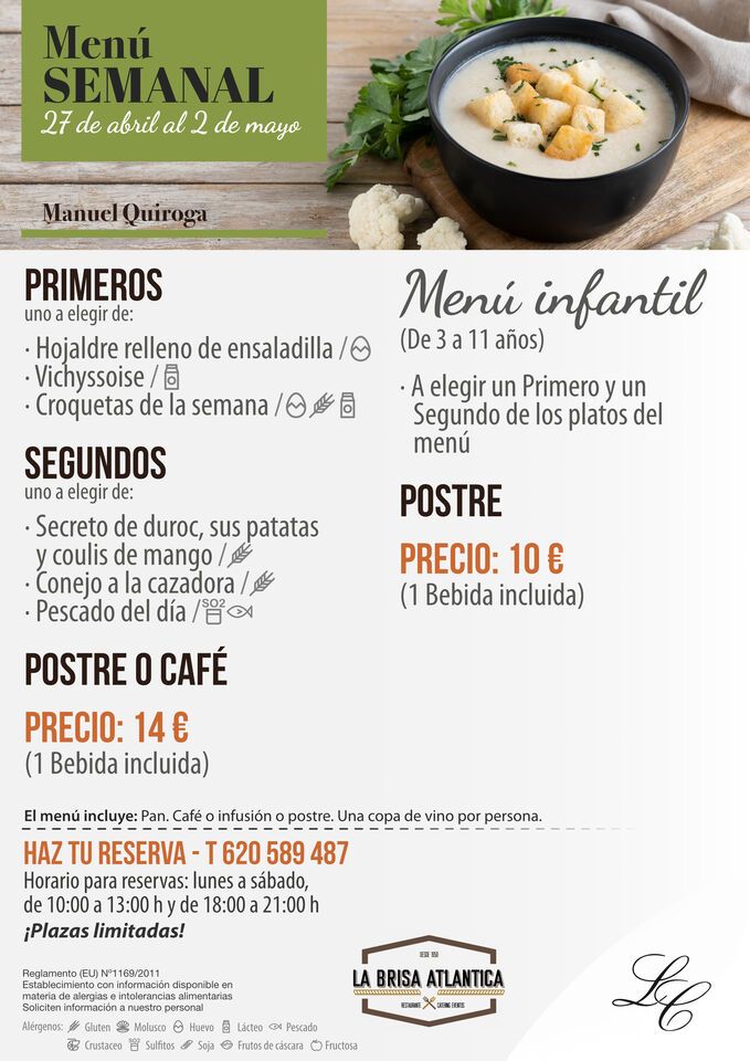 Menú Semanal en Manuel Quiroga del 27 de abril al 2 de mayo 2026