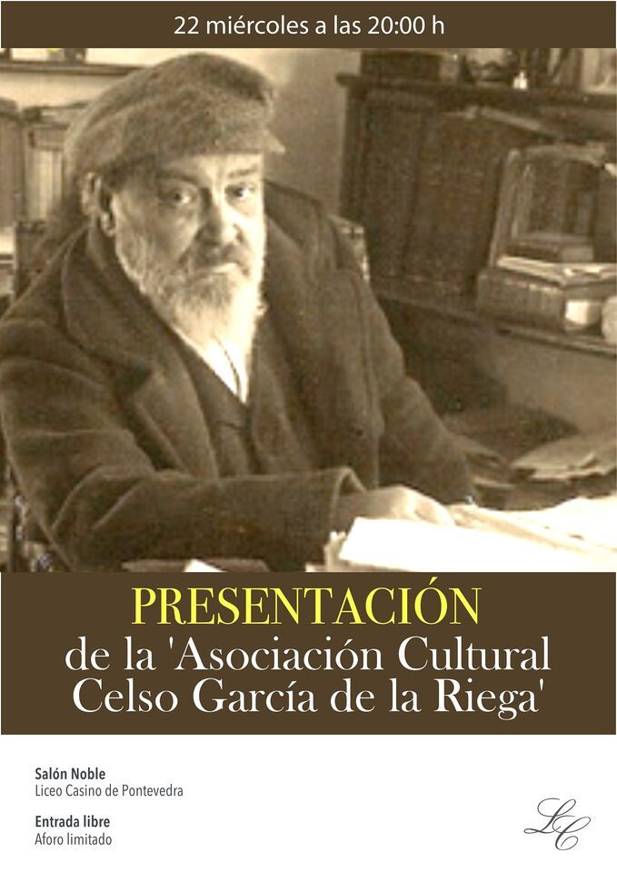 El miércoles día 22, a las 20:00 horas en el Salón Noble, se presenta la nueva «Asociación Cultural Celso García de la Riega».