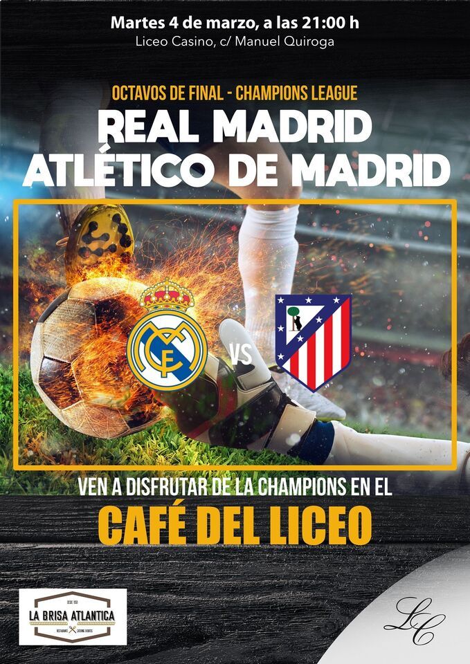 El martes 4 de marzo a las 21:00 horas, en la cafetería Liceo, retransmitiremos el partido del octavos de final de la Champions League entre el Real Madrid y el Atlético de Madrid.