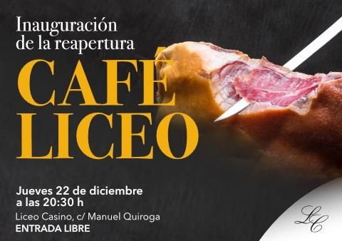 CAFÉ LICEO. Jueves 22 de diciembre, a las 20:30 h. tendrá lugar la inauguración de la reapertura del Café Liceo con degustación de jamón al corte con maestro jamonero y pinchos variados, restableciéndose a partir de este momento el servicio de cafetería con el siguiente horario: