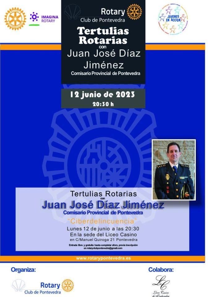 El día 12 de junio a las 20,30 h. la sede social de Manuel Quiroga acoge una nueva Tertulia Rotaria esta vez a cargo de D. Juan José Díaz Jiménez, Comisario Provincial de Pontevedra, con el tema "Ciberdelincuencia".