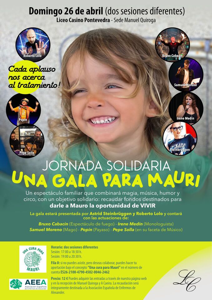 Ven a disfrutar de un espectáculo familiar que combinará magia, música, humor y circo, pasarás una tarde divertida con tu familia y amigos y además... y lo mejor de todo: al tiempo que disfrutas del espéctáculo estarás colaborando con la familia de Mauri ya que la recaudación estará íntegramente destinada a financiar su cura (la enfermedad de Alexander).